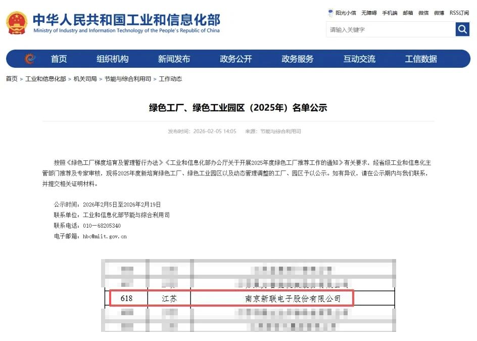近日,国家工业和信息化部公示了2025年国家级绿色工厂、绿色工业园区名单,南京新联电子股份有限公司成功跻身榜单。此次评选严格依据《绿色工厂梯度培育及管理暂行办法》《工业和信息化部办公厅关于开展2025年度绿色工厂推荐工作的通知》等文件要求,经过省级工信部门推荐、专家审核等多重环节。